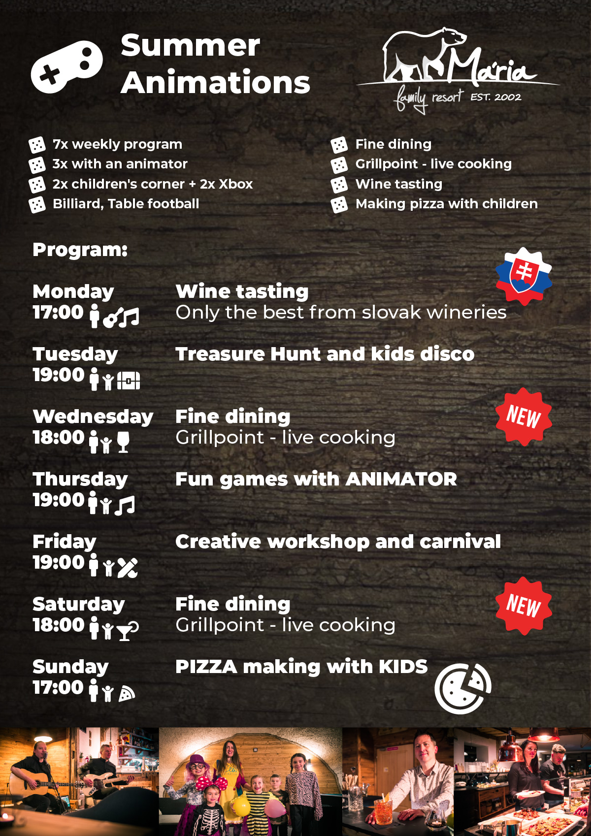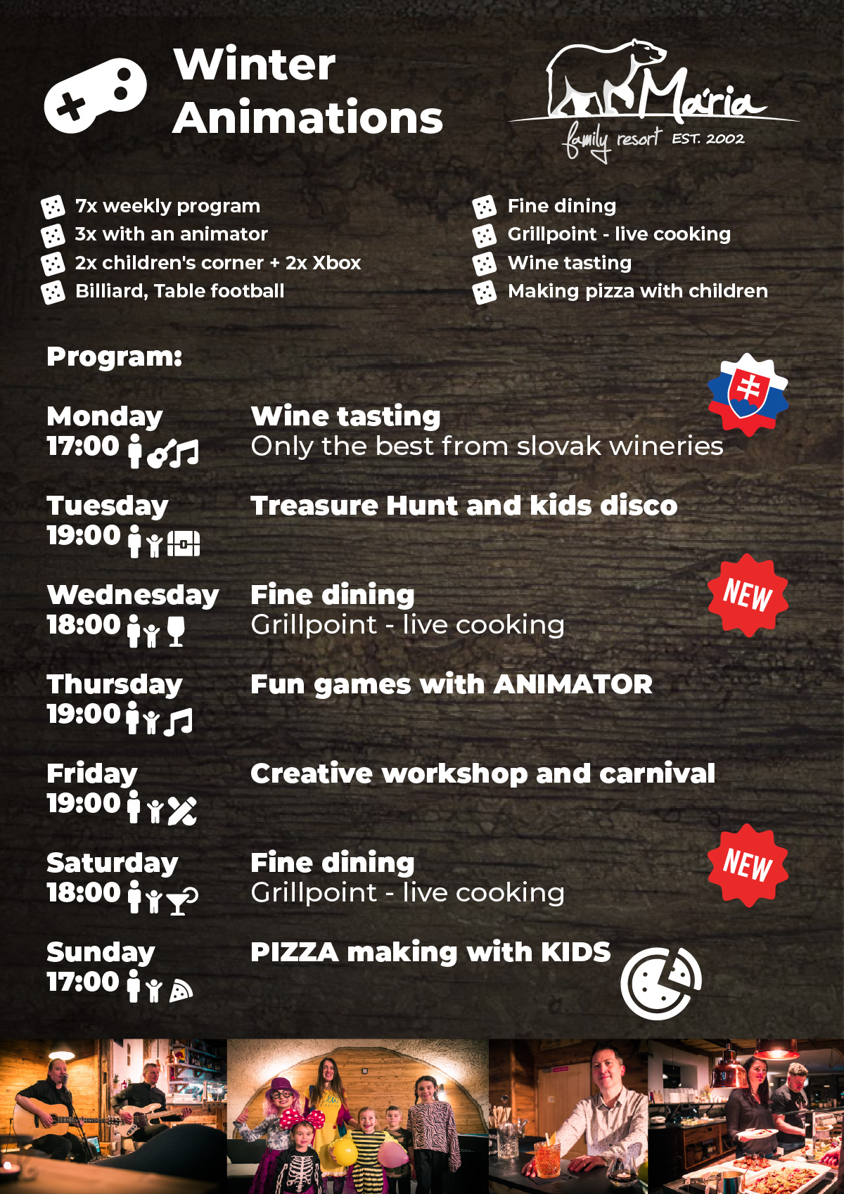 We have prepared thematic weekends for you in Spring 2025. See if you can find something you like. Children as well as adults can use the popular Fun zone where you can also find the latest Xbox with a large TV, Billiards, Kalčeto (table football).