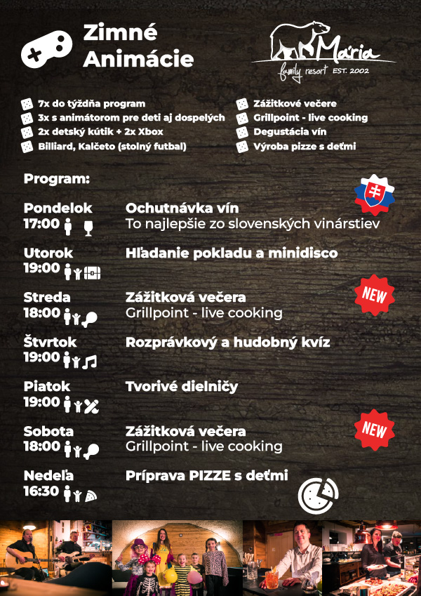 Jar 2026 pripravujeme. Na Jar 2025 sme si pre vás pripravili tématické Víkendy. Pozrite sa, či si aj vy nájdete niečo čo sa vám zapáči. Deti ale aj dospelý môžu využiť obľúbenú Fun zónu kde nájdete aj najnovší Xbox s veľkým TV, Billiard, Kalčeto (stolný futbal).