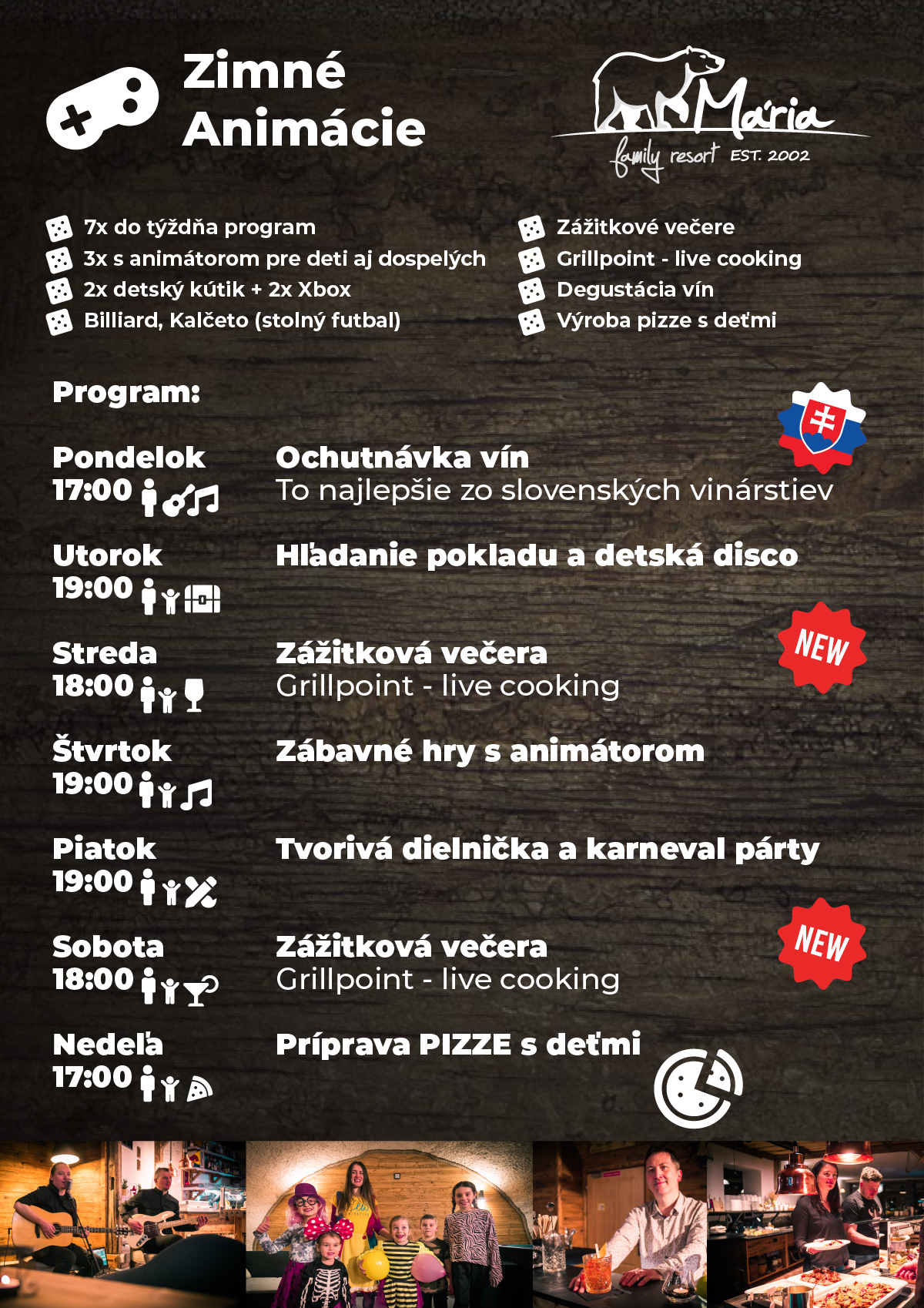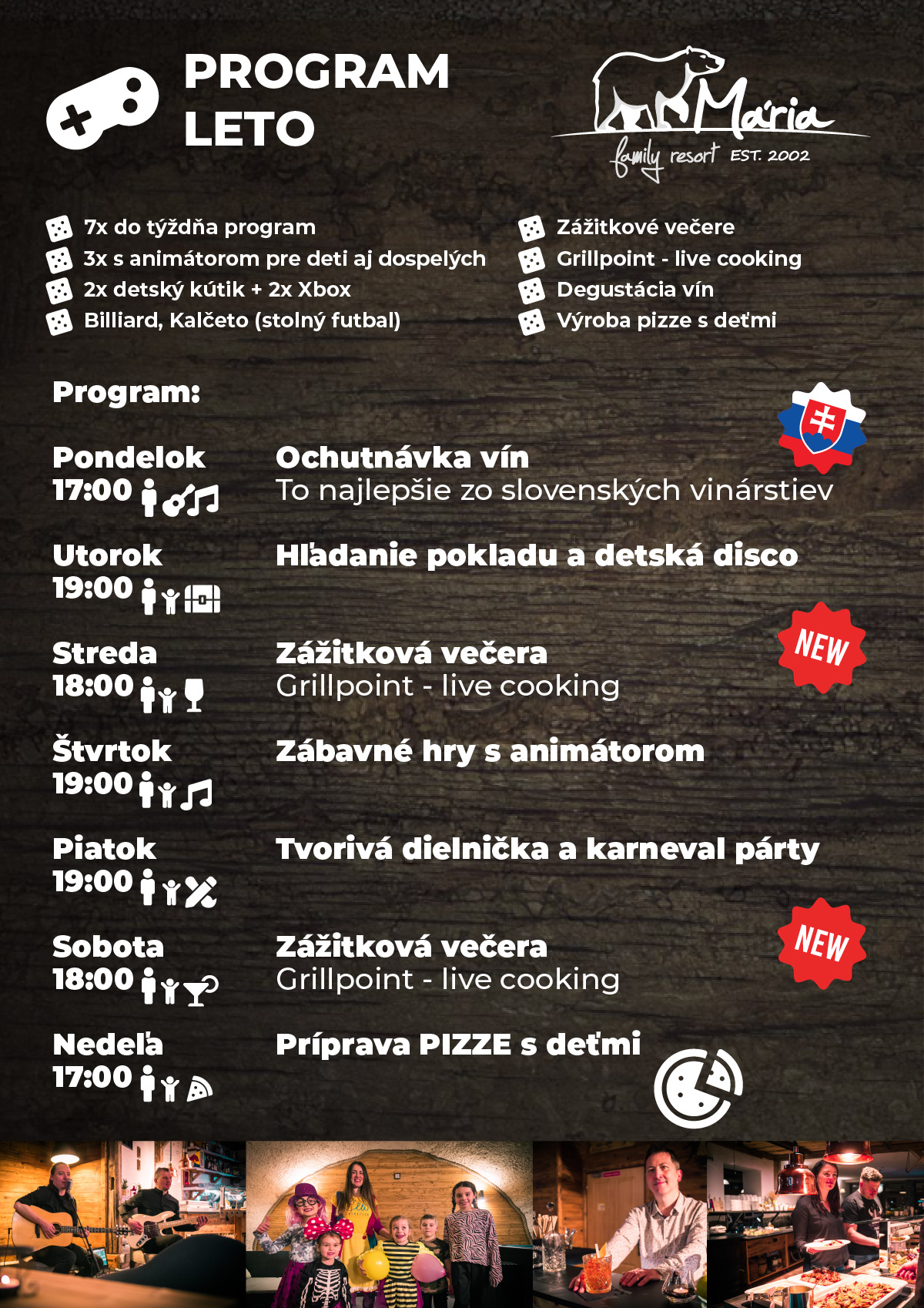 Jar 2026 pripravujeme. Na Jar 2025 sme si pre vás pripravili tématické Víkendy. Pozrite sa, či si aj vy nájdete niečo čo sa vám zapáči. Deti ale aj dospelý môžu využiť obľúbenú Fun zónu kde nájdete aj najnovší Xbox s veľkým TV, Billiard, Kalčeto (stolný futbal).